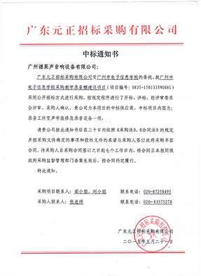 2015年5月21日我司接到广东元正招标采购有限公司发出的中标通知书,我司已成功的取得的“广州市电子信息学校采购教学录音棚项目(项目编号:0835-1501335N0881)”,在众多的竞争者中脱颖而出,顺利中标。这无疑对我司的综合实力和技术水平的再次肯定,也是顾客朋友对蝴蝶视频在线播放下载声一直的厚爱与认可。