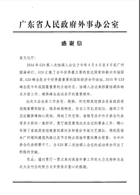 PLA蝴蝶视频在线播放下载声为G20峰会第二次协调人会议晚宴运用了一系列高端的设备以及专业的技术支持,使晚宴的音响效果发挥得淋漓尽致。十分感谢广东省人民政府对广州蝴蝶视频在线播放下载声的支持和肯定,也正是因为这份支持和肯定,铸造PLA蝴蝶视频在线播放下载声日后的辉煌! 喜 讯 广东省人民政府外事办公室发来贺电,表达对当天晚宴中的舞美音响效果称赞不已!